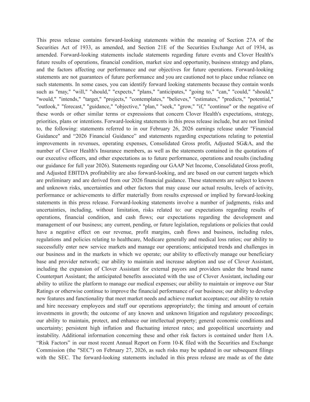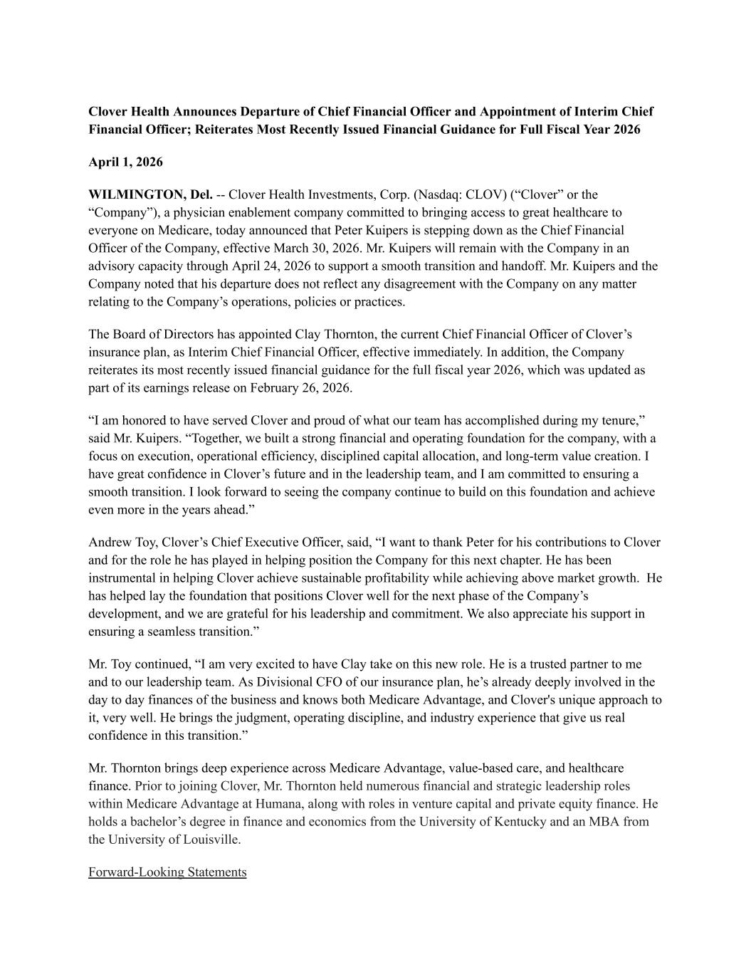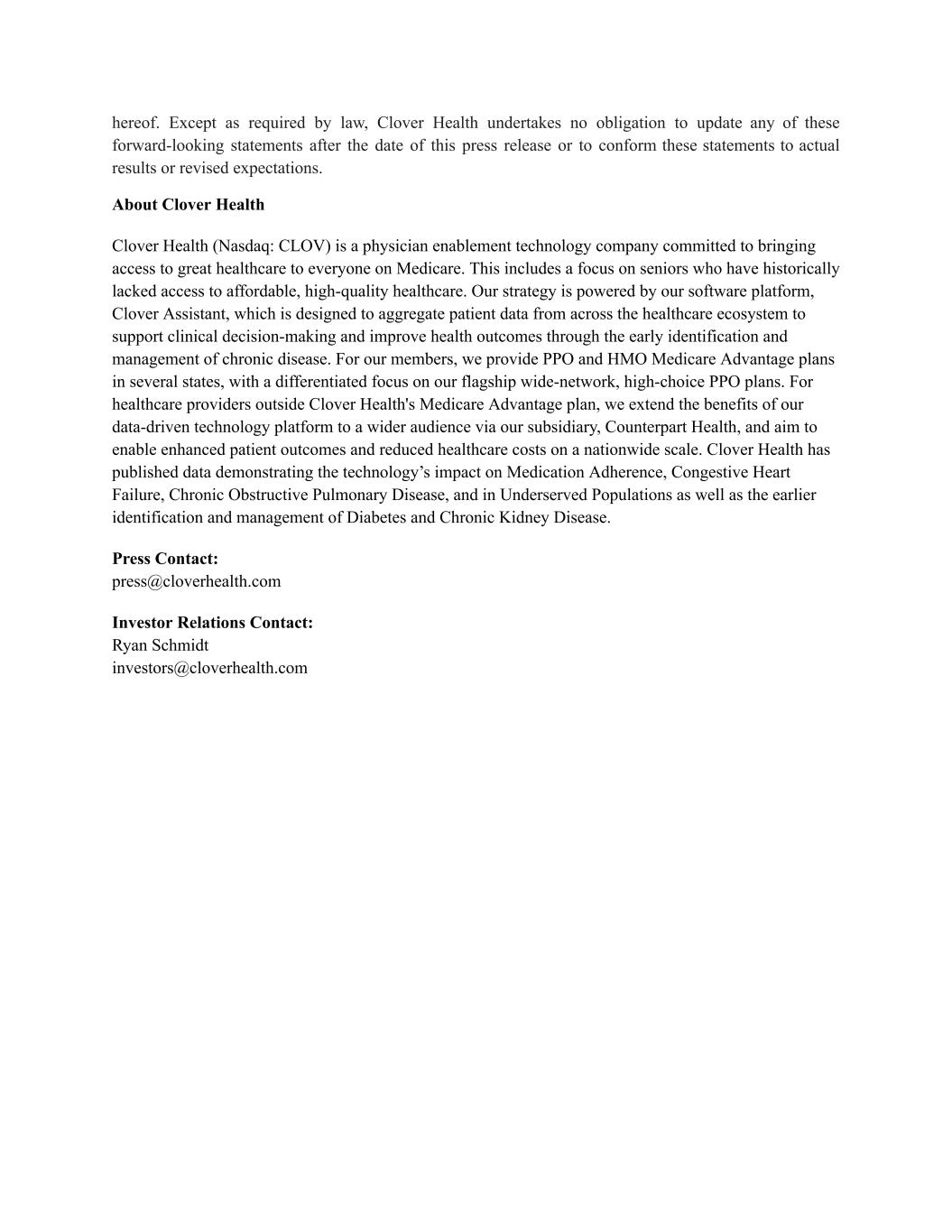 | | | Clover Health Investments, Corp. |