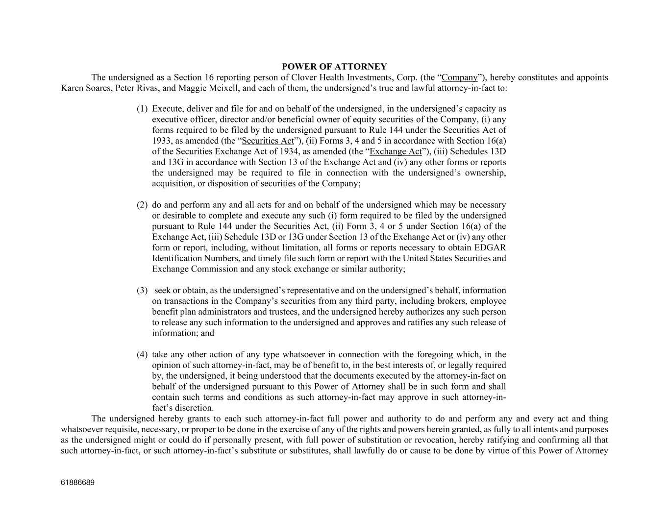 61886689 POWER OF ATTORNEY The undersigned as a Section 16 reporting person of Clover Health Investments, Corp. (the “Company”), hereby constitutes and appoints Karen Soares, Peter Rivas, and Maggie Meixell, and each of them, the undersigned’s true and lawful attorney-in-fact to: (1) Execute, deliver and file for and on behalf of the undersigned, in the undersigned’s capacity as executive officer, director and/or beneficial owner of equity securities of the Company, (i) any forms required to be filed by the undersigned pursuant to Rule 144 under the Securities Act of 1933, as amended (the “Securities Act”), (ii) Forms 3, 4 and 5 in accordance with Section 16(a) of the Securities Exchange Act of 1934, as amended (the “Exchange Act”), (iii) Schedules 13D and 13G in accordance with Section 13 of the Exchange Act and (iv) any other forms or reports the undersigned may be required to file in connection with the undersigned’s ownership, acquisition, or disposition of securities of the Company; (2) do and perform any and all acts for and on behalf of the undersigned which may be necessary or desirable to complete and execute any such (i) form required to be filed by the undersigned pursuant to Rule 144 under the Securities Act, (ii) Form 3, 4 or 5 under Section 16(a) of the Exchange Act, (iii) Schedule 13D or 13G under Section 13 of the Exchange Act or (iv) any other form or report, including, without limitation, all forms or reports necessary to obtain EDGAR Identification Numbers, and timely file such form or report with the United States Securities and Exchange Commission and any stock exchange or similar authority; (3) seek or obtain, as the undersigned’s representative and on the undersigned’s behalf, information on transactions in the Company’s securities from any third party, including brokers, employee benefit plan administrators and trustees, and the undersigned hereby authorizes any such person to release any such information to the undersigned and approves and ratifies any such release of information; and (4) take any other action of any type whatsoever in connection with the foregoing which, in the opinion of such attorney-in-fact, may be of benefit to, in the best interests of, or legally required by, the undersigned, it being understood that the documents executed by the attorney-in-fact on behalf of the undersigned pursuant to this Power of Attorney shall be in such form and shall contain such terms and conditions as such attorney-in-fact may approve in such attorney-in- fact’s discretion. The undersigned hereby grants to each such attorney-in-fact full power and authority to do and perform any and every act and thing whatsoever requisite, necessary, or proper to be done in the exercise of any of the rights and powers herein granted, as fully to all intents and purposes as the undersigned might or could do if personally present, with full power of substitution or revocation, hereby ratifying and confirming all that such attorney-in-fact, or such attorney-in-fact’s substitute or substitutes, shall lawfully do or cause to be done by virtue of this Power of Attorney