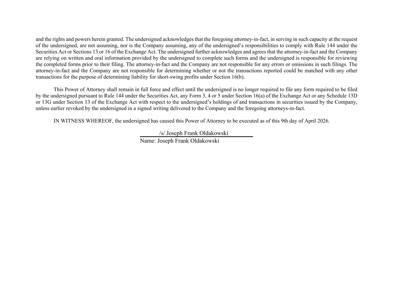 and the rights and powers herein granted. The undersigned acknowledges that the foregoing attorney-in-fact, in serving in such capacity at the request of the undersigned, are not assuming, nor is the Company assuming, any of the undersigned’s responsibilities to comply with Rule 144 under the Securities Act or Sections 13 or 16 of the Exchange Act. The undersigned further acknowledges and agrees that the attorney-in-fact and the Company are relying on written and oral information provided by the undersigned to complete such forms and the undersigned is responsible for reviewing the completed forms prior to their filing. The attorney-in-fact and the Company are not responsible for any errors or omissions in such filings. The attorney-in-fact and the Company are not responsible for determining whether or not the transactions reported could be matched with any other transactions for the purpose of determining liability for short-swing profits under Section 16(b). This Power of Attorney shall remain in full force and effect until the undersigned is no longer required to file any form required to be filed by the undersigned pursuant to Rule 144 under the Securities Act, any Form 3, 4 or 5 under Section 16(a) of the Exchange Act or any Schedule 13D or 13G under Section 13 of the Exchange Act with respect to the undersigned’s holdings of and transactions in securities issued by the Company, unless earlier revoked by the undersigned in a signed writing delivered to the Company and the foregoing attorneys-in-fact. IN WITNESS WHEREOF, the undersigned has caused this Power of Attorney to be executed as of this 9th day of April 2026. /s/ Joseph Frank Oldakowski Name: Joseph Frank Oldakowski